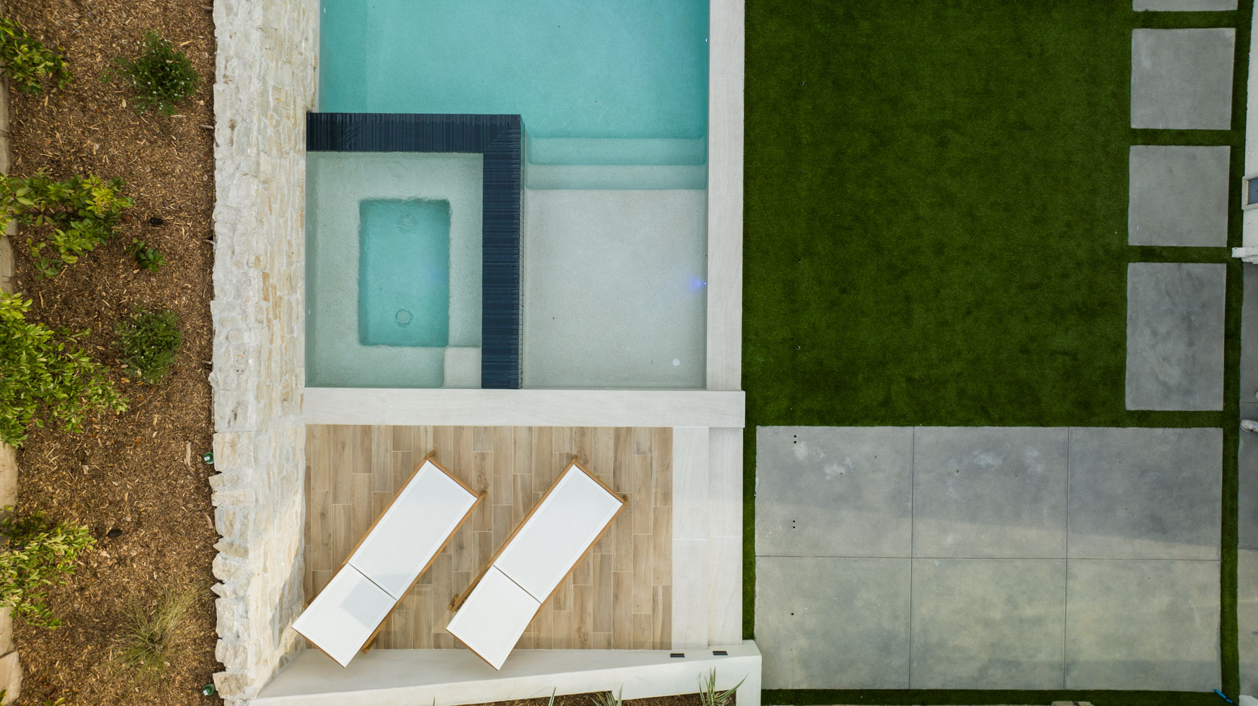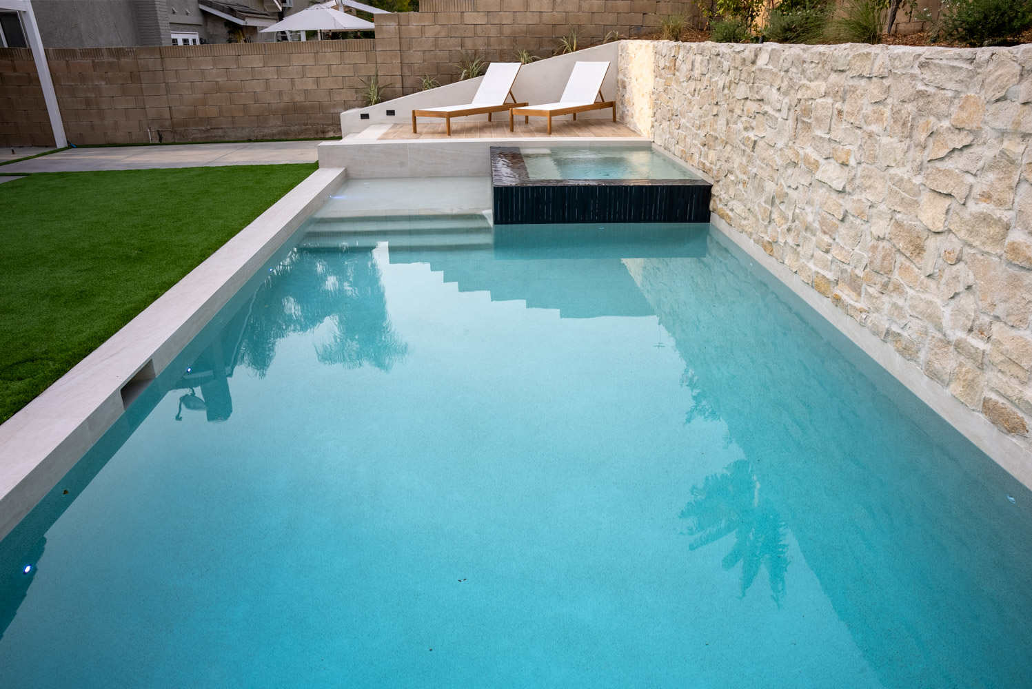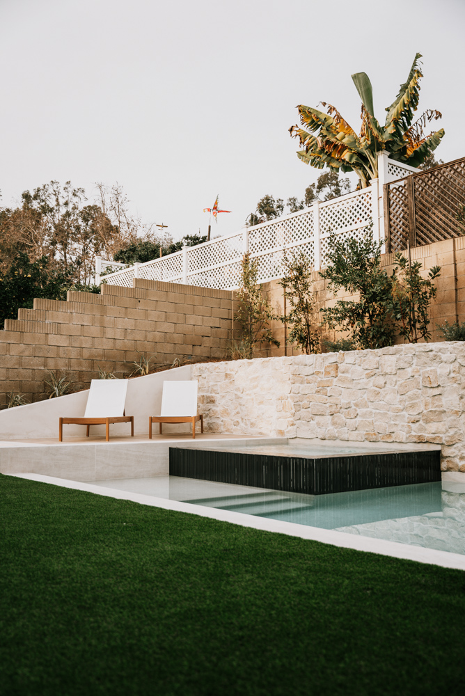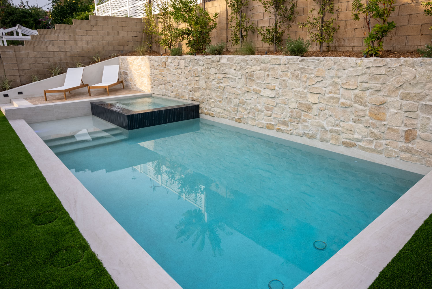 Raised spa spillover, baja shelf, stepping stones