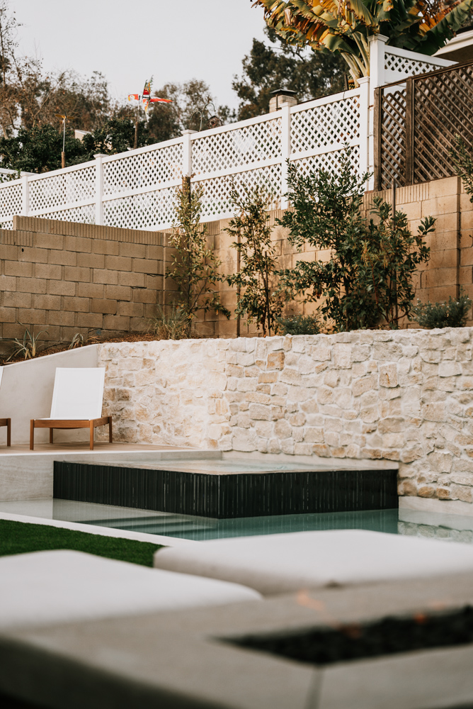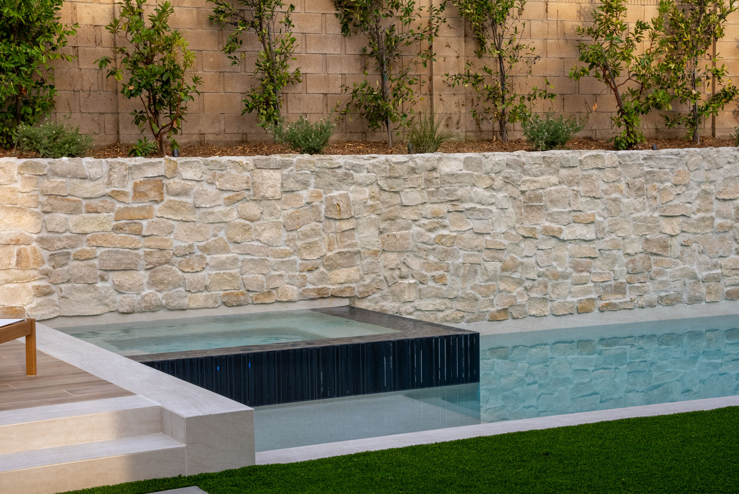 Synthetic turf, stacked stone wall, citrus trees