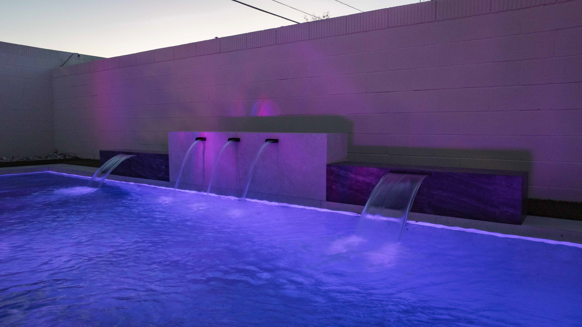 Triple scupper water feature with raised pedestal, sheer descent spillway from dark stone raised wall element, color-changing RGB LED system